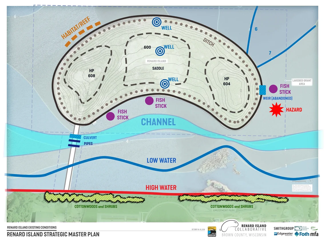 Renard Island is one of the only areas in the Green Bay metropolitan area that provides direct access to the waters of the bay of Green Bay. With the transfer of ownership, the County is now looking at end-use options for the 55-acre island. In 2018, the County received a grant from the Wisconsin Coastal Management Program and matching funds from McDonald Lumber, NEW Water and WPS to complete an End-Use Plan for the island. In order to accomplish this, Brown County worked with a group of stakeholders to review and provide input for the plan and design process. After more than 18 months of work and numerous public meetings, the final Renard Island Strategic Master Plan was adopted by the Brown County Board on December 16, 2019.